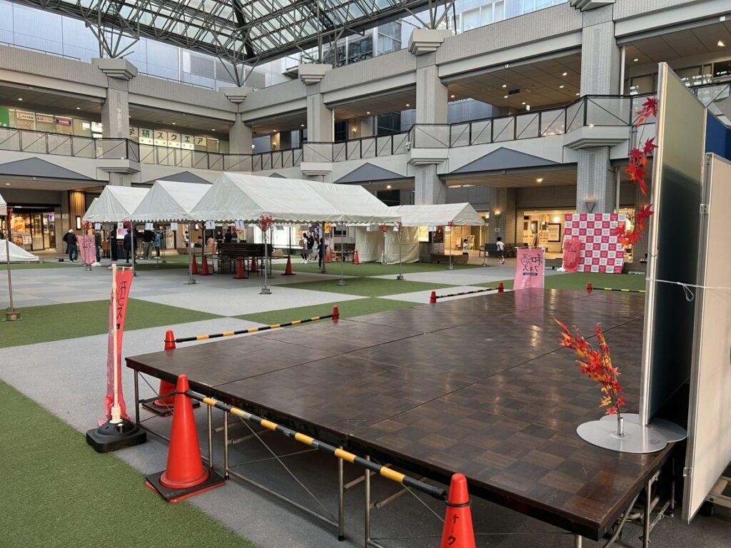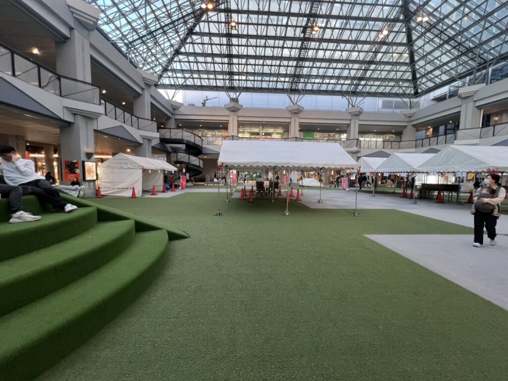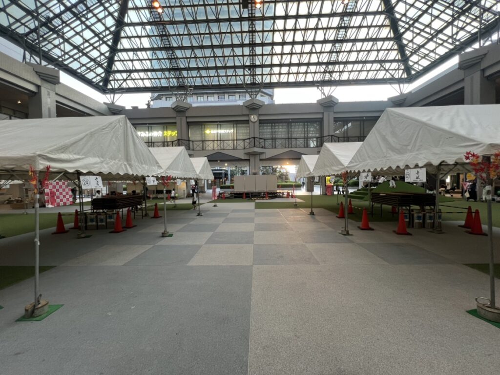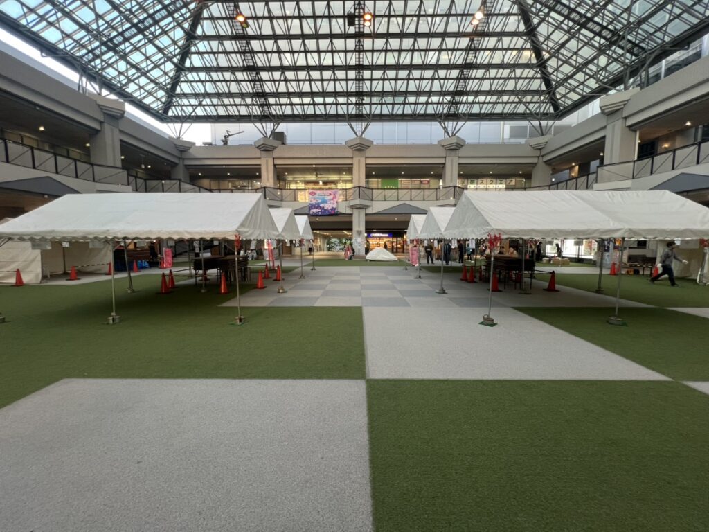 会場は広々とした屋内スペースで、白いテントが整然と並び、中央には来場者が行き交う通路を確保。安全面にも配慮し、動線や設営位置には細心の注意を払いました。